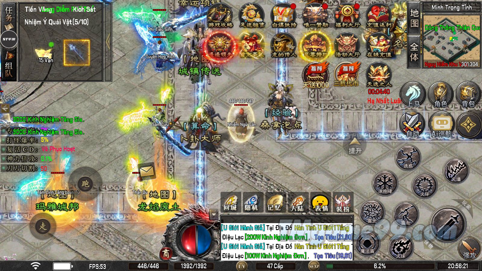 - Phúc lợi khởi đầu: Tự động nhặt, tự động quy đổi, thần sủng hỏa long, hồi máu hỏa long, thần kỹ siêu cấp